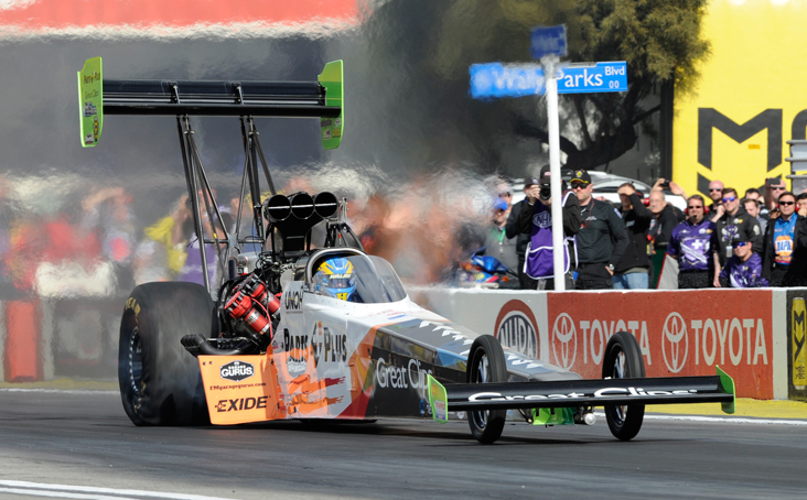 Top Fuel Q4 (5:05 p.m.): Leah Pritchett was the star of pre-season testing last weekend in Phoenix, and she finished qualifying as the star once again after powering her Papa John’s dragster to a career-best 3.672. Doug Kalitta, the incoming qualifying leader, ran his third straight 3.6-second pass, a 3.693, but it wasn’t enough to retake the No. 1 spot, which earns the polesitter a first-round bye in the 15-car field.