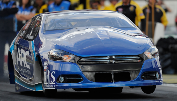 Funny Car Q3 (2:50 p.m.): John Force was the star of the third round of qualifying, posting a 3.849 that moved him up to No. 2 in the order, behind Matt Hagan, who retained the top spot thanks to yesterday’s 3.840. The big story on Force’s run wasn’t the e.t., however. It was the speed. Force rocketed to a speed of 335.15 mph, the second-fastest run in history behind Hagan’s 335.57 from Topeka last season. The speed not only added Force’s name to the fastest runs list, but it also gave him the edge over daughter Courtney in the qualifying order because the father-daughter duo recorded identical times. Courtney’s speed was 330.23, relegating her to the third spot. While the Forces are near the top of the order, their teammate, Robert Hight, surprisingly is not. Hight has struggled in his special-edition Auto Club/California Highway Patrol Chevy, posting a best of 4.69 that has him on the bump entering the final session. [Complete results]
