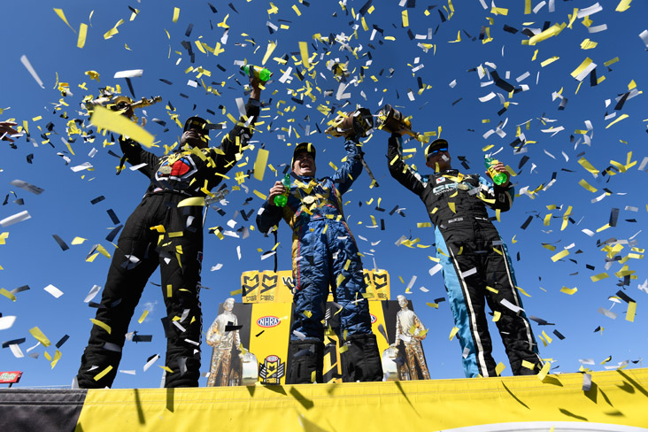 TOP FUEL SEMIFINALS (3 p.m.): Antron Brown reached his 80th career Top Fuel final by beating Don Schumacher Racing teammate Leah Pritchett in a tight semifinal matchup. He edged her down the track by .003-second after taking her down at the Tree by .051-second. Steve Torrence stretched his round-winning streak to 11 by cruising past Clay Millican. His pass of 3.718 seconds eased past Millican’s 3.822 as Millican’s car blew at the finish line. Torrence has only beaten Brown once in 22 tries; that’s a record he’ll have to reverse if he wants to take home his third-straight Wally.