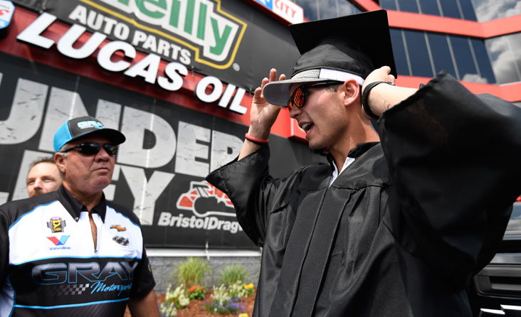 Gray walked out in his cap and gown during driver introductions, which also means we can’t call the 18-year-old a student of anything but Pro Stock anymore. He’s certainly learned quickly. The rookie entered Bristol in third place behind Bo Butner and Greg Anderson.