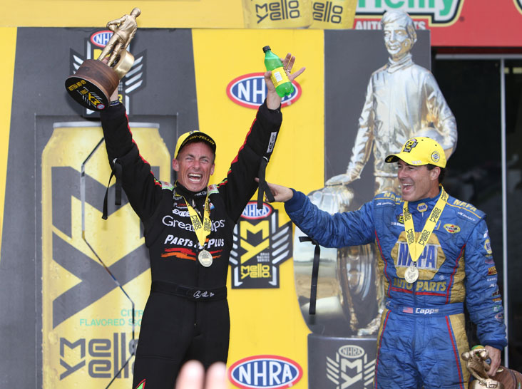 FUNNY CAR FINAL (6 p.m.): After struggling throughout qualifying, Ron Capps, near lane, completed a great comeback by collecting his fifth win of the season, avenging last weekend’s final-round loss to Jack Beckman, beating his teammate on a 4.054 to 4.040 holeshot.