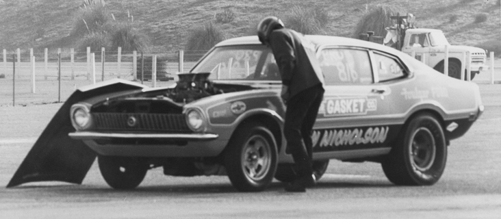 Landy, whose Mopar Challenger featured a unique ignition system, with two distributors and 16 spark plugs firing his 426 Hemi, red-lighted against Jenkins, who ran another 9.98. Landy had some consolation as he went on to win Modified eliminator.