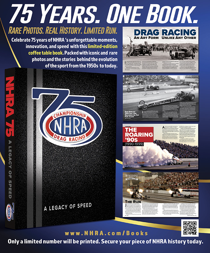 NHRA 75: A Legacy of Speed is a handsome, 208-page coffee-table-style book that chronicles the sport's meteoric rise from humble beginnings to superstar stature. It's packed with historic photos, some of which have never been published, and presents the history of the NHRA in chronological fashion, allowing fans to relive the magic. Sprinkled through the book are features on legends of the quarter-mile, memorable moments, and technological breakthroughs that powered the sport.