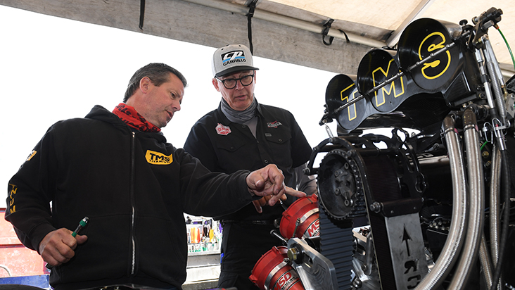 And now in Pomona, at the most famous of West Coast dragstrips, they’ve got another pair of aces in their corner in world champion nitro crew chief Rahn Tobler and veteran crew chief and “fixer” Johnny West, who are heling tune the car and get the team on solid footing.