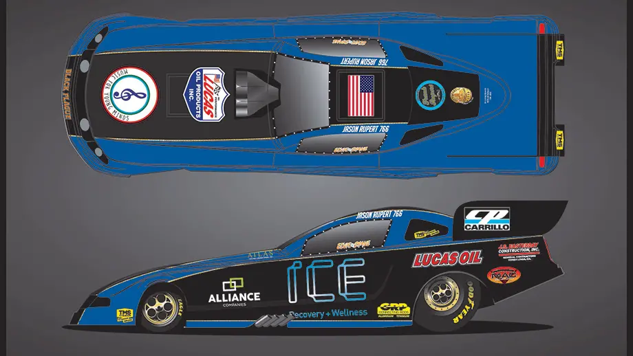 In addition to ICE Recovery + Wellness, Rupert's sponsors include Alliance Companies, Lucas Oil, J.S. Easterday Construction, Music for Young Minds Foundation, MAC Speed Shop, Shell Roofing Solutions, CP-Carrillo, TMS Titanium, Bryant Racing, GRP Connecting Rods, Boninfante Friction, Manley, Atlas Testing, and Littlefield Blowers.