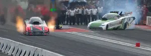What is probably local favorite Jim Maroney's last race in Top Fuel for a while due to business concerns, he had to shut off after the burnout after a bad fuel nozzle was spraying nitro onto the rear slicks, then watched in disbelief as opponent Austin Prock smoked the tires in the other lane.