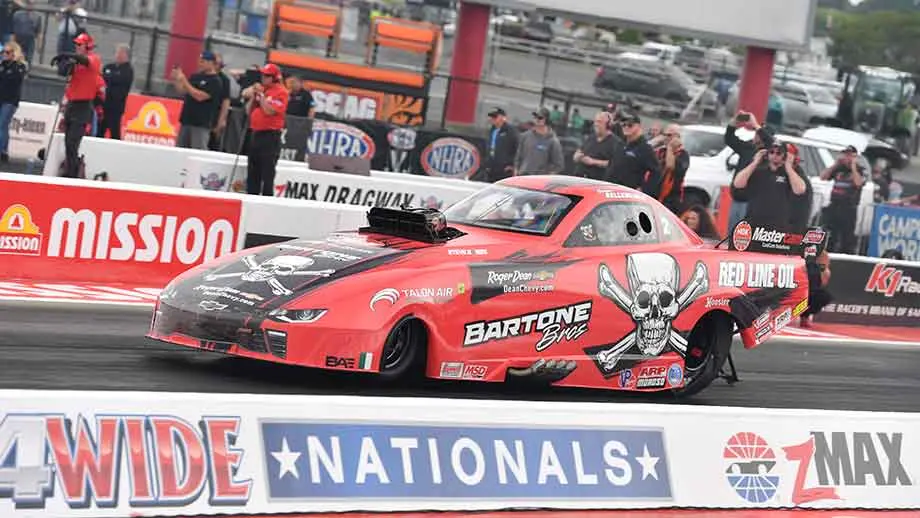 Sean Bellemeur emerged victorious from a tough Top Alcohol Funny Car quad that included D.J. Cox, Bob McCosh, and Matt Gill. All four drivers had competitive reaction times and Bellemeur was able to wheel the Bartone Bros. entry to a 5.42 to hold off the 5.44 of Cox, while McCosh and Gill were in the mix with a pair of 5.46 runs. [video]