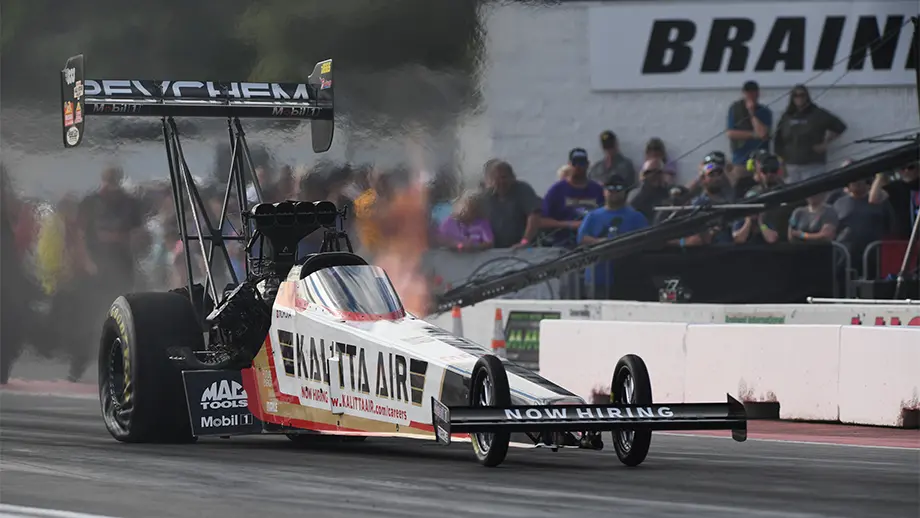 A bunch of tire smoke for Antron Brown sends the defending event champion back to the pits for the day. World champ Doug Kalitta takes the Mac Tools rail to a winning 3.689, 331.20 – the third quickest run of the weekend. That pits Kalitta against teammate Langdon for round two.