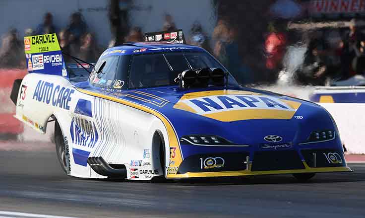 There were a host of three-second runs during the twilight Funny Car session, but none were quicker than Austin Prock’s 3.893 in the Cornwell Tools Camaro. Prock not only earned the provisional pole, but also grabbed a $4,000 bonus, a special guitar trophy, and 100 cases of American Rebel Light beer for his efforts.