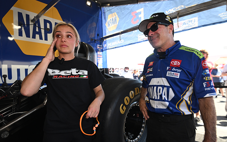Future Top Fuel pilot Maddi Gordon warms up Ron Capps' Funny Car