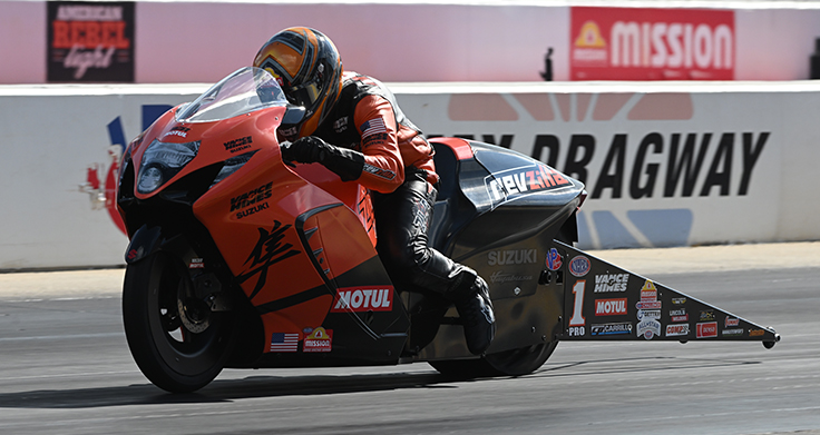 Pro Stock Motorcycle’s Gaige Herrera picked up his sixth No. 1 qualifier of the season thanks to Friday’s 6.757 at 201.22 on his RevZilla/Motul/Vance & Hines Suzuki, ending his day in strong fashion with a run of 6.772.