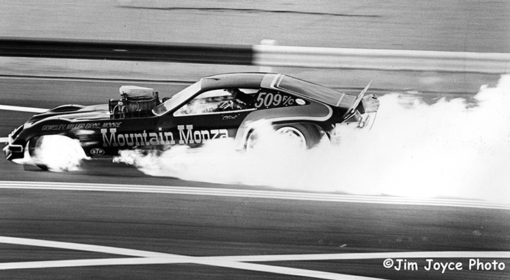 Another great shot that Joyce took was Clint Miller lighting up the Mountain Monza at the 1976 NHRA Winternationals.