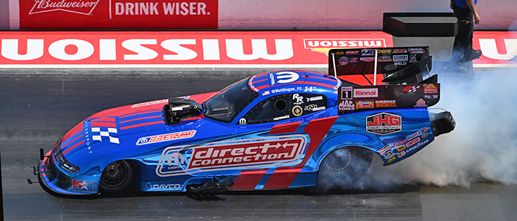 Matt Hagan advanced to the Mission Challenge Funny Car final with a 4.12 win -- he said afterwards that his crew remotely shut the engine off downtrack as it was beginning to misfire -- finishing just ahead of Chad Green’s fiery 4.196 with tire-smoking Bobby Bode and Jack Beckman finishing third and fourth. Although Green’s run was expensive, it took him from outside the field into the quick 16.