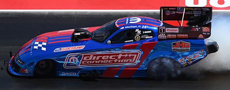 Matt Hagan will get a chance to collect his fourth four-wide win and become Funny Car’s most successful racer in the format after winning his quad with a 4.126 just ahead of Paul Lee’s 4.140; J.R. Todd and Dan Wilkerson were sent to the trailer.