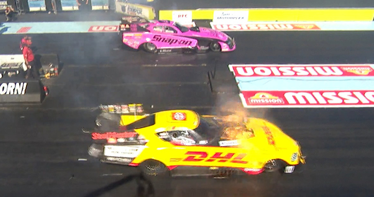 Alex Laughlin, in what is probably his last race subbing for Buddy Hull this season, left on Ron Capps by six-hundredths but couldn’t hold the lead after dropping a cylinder. Capps streaked to the win but paid the price with a blower backfire.