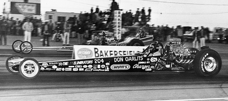 Garlits didn’t win Bakersfield again until 1971 in his revolutionary Swamp Rat 14, again following a Winternationals win — the shot heard ‘round the drag racing world — beating Rick Ramsey and the front-engine Keeling & Clayton car on a holeshot in the Bakersfield final, 6.71 to 6.64.