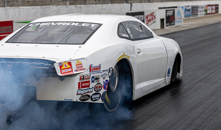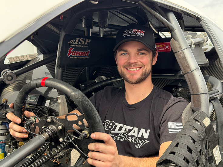 At the beginning of the year at Mooresville Dragway, the small racetrack just around the corner from the KB Titan Racing shop, Cody got his feet wet in the team's burnout car — the blacked-out machine is the skeleton of the Pro Stock car his father drove to the 2010 world championship. Glenn, who has been integral in the development of new drivers for the team, made his own initial efforts in the burnout car as well. It is equipped with a traditional Pro Stock clutch and shifter and functions in the same way a complete car does, and it has been a helpful tool in educating drivers new to the class.