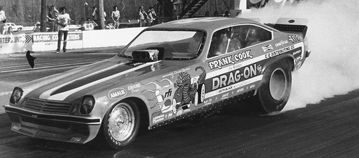 Cook was awarded NHRA Sportsman driver of the year in 1974, then moved to blown Alcohol Funny Car with sponsorship from Racing Fuels Inc. in the famous Drag-On Vega. The All American Funny Car Series, founded in 1978, was a group of about 15 Blown Alcohol Funny Cars who booked races all over including the NHRA WCS races. Frank and new partner Chuck Lander enjoyed immediate success in 1978 winning 10 of 13 races run. They went on to win two more AFC Championships, four NHRA Division 4 Championships, and Cook was named Driver of the year three more times.