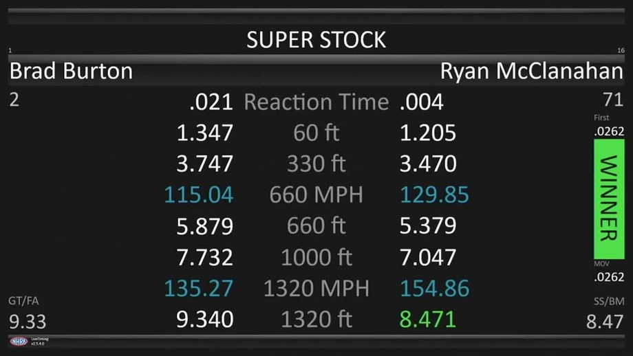 A pair of world champions went to battle in the Super Stock final where Ryan McClanahan got the best of Brad Burton thanks to an almost perfect run that included a .004 light and a 9.471 on his 9.47 dial. McClanahan now has 12 wins, including three…