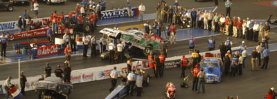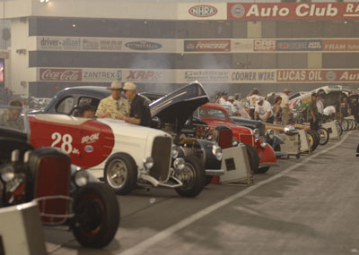 Lined up just behind the starting line at Auto Club Raceway at Pomona were some of the biggest names in drag racing, past and present. Kenny Bernstein, Bill "Grumpy" Jenkins, Joe Amato, Dale Armstrong, all members of the exclusive club of top 10 finishers from 2001's salute to NHRA's top 50 racers. Flanking them to their right were NHRA division directors from past and present and Steve Gibbs, vice president of The Wally Parks NHRA Motorsports Museum. To their left were drag racing icons Marv Rifchin of M&H Tires and Linda Vaughn and Sport Service founder Chick Saffel. Further to their left were members of NHRA's board of directors.