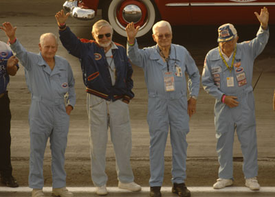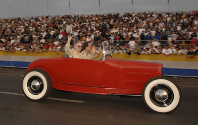 Down the return road rolled Wally's sons, Richard and David, at the wheel of the re-created version of Wally's famed '29 Model A roadster, to the cheers of the crowd, preceded by Parks' record-setting Suddenly Plymouth.