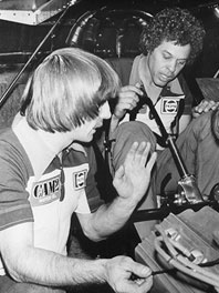 Prudhomme sat in the cockpit, talking to Brandt and longtime crewmember Willie Wolter, and it's a photo I've seen dozens of times in magazines throughout three decades -– "the Snake" hunched over the butterfly steering wheel observing preparations. I dug through our photo archives for a similar photo and found this one, from the early '80s, of Prudhomme and Brandt preparing to fire their car. I also was quite struck going through our voluminous photo files of the many pictures of Prudhomme thrashing on his car, cleaning cylinder sleeves, toting bellhousings, adjusting linkages, and more, things you'd never see a Tony Schumacher or a Rod Fuller do these days. That's no knock on them; that's just the way it was back then. They didn’t just drive 'em.