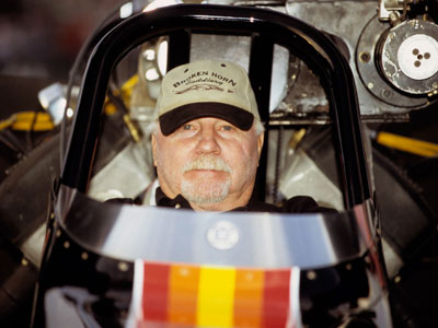 Along the return road sat more than 30 hot rods at the ready, spanning the ages and the classes, from pre-war roadsters and dry lakes cars to front-engine dragsters and 1970s Funny Cars. From finish line to starting line, the cars became more contemporary and included one representative from every class of the sport, from Jr. dragsters to sport compacts, Stockers, alcohol cars, and Pro Stocks. On the starting line were Mike Neff's Castrol GTX Mustang and Doug Kalitta's Mac Tools Top Fueler. There was Art Chrisman's famed #25, the Glass Slipper, the Magicar, and Larry Dixon's Howard Cam Rattler, familiar machines to museum and Cacklefest veterans. There was Don Prudhomme's U.S. Army Arrow and Don Garlits' Swamp Rat III, with "the Snake" and "Big Daddy" themselves at the wheel.
