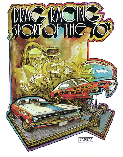 | "What makes this illustration a personal favorite is the fact that it was probably my first commissioned full-color painting. Previously, most of my drawings were done in black and white with pencil or pen and ink, and just occasional spots of color added for accent. Wally Parks asked me to do this prior to the start of 1970's NHRA Super Season, in which the national event schedule expanded from four to seven races, something that the entire organization was very excited about. The concept was to represent the Top Fuel cars, which had been around since day one, in a flat pattern with monotone sepia colors. The Funny Cars, which had just become a full-time NHRA eliminator in 1969, and the Pro Stockers, which were making their debut in 1970, were to be drawn in a more three-dimensional style and in full color to promote their status as relatively new attractions to the sport.
