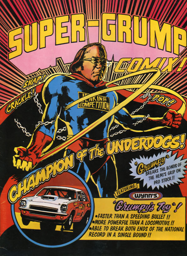 "Following Jenkins’ virtually undefeated season in 1972, I thought that a Superman comic book cover would be a natural for 1973, but it took a month to talk him to it. After mostly positive feedback, he was more receptive to other concepts that followed. For the 1974 'Grumpy Rides Again,' I rented a cowboy outfit from Western Costume Supply Co., which provided everything from Roman togas to Civil War uniforms to Hollywood motion picture studios. We shot the pictures during the 1973 Supernationals at Ontario Motor Speedway, where the Pro Stock teams had access to the facility’s enclosed garages. I suggested to Jenkins that we could take the pictures inside the garage, but he insisted that we do them outside in the pit area. As soon as he walked out the door in his cowboy regalia, complete with the 20-gallon hat, a huge crowd began to gather, and it swelled to about 500 people who began taking their own pictures. Jenkins enjoyed every minute of hamming it up before the fans, an aspect of his personality that was rarely seen. Each of these covers was painted well before the advent of computer graphics, and virtually all of the lettering was done by hand.” |