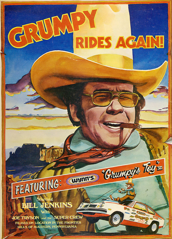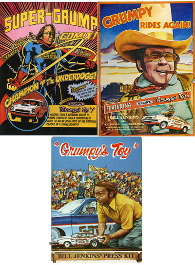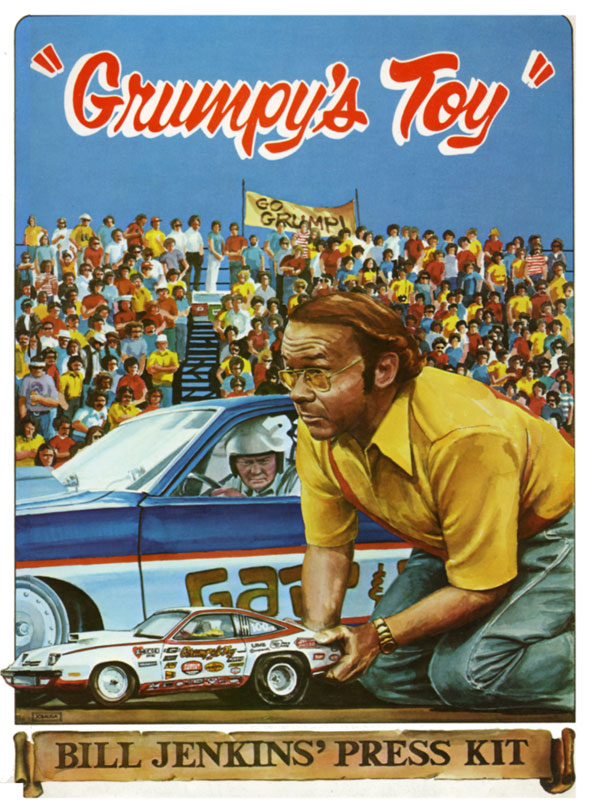 | '“Probably the most enjoyable series of paintings I was ever associated with, in terms of latitude of creativity and just having a great time doing them, were the press kit covers that for Bill “Grumpy” Jenkins from 1970 to 1978. The first two or three examples were very straightforward with the simple combination of a face and car shot, but I got the idea that it might be fun to put Jenkins in situations somewhat unlike the “Grumpy” persona that he had cultivated for so many years.