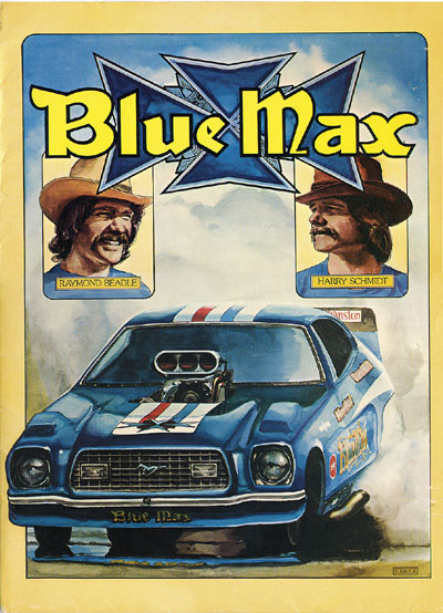 | "There were several other racers for whom I did press kit covers, including Don Prudhomme, Barry Setzer, Bob Glidden, Don Nicholson, Paul Blevins, and Gary Gabelich. In this example, for the Blue Max Funny Car team of Raymond Beadle and Harry Schmidt, I eliminated much of the ink outlines that I usually drew around each subject matter. I felt it made it more of a painting rather than an illustration. It was always enjoyable to work with cars that had colorful paint schemes like the Blue Max, and the photograph that I worked from gave me lots of great areas for rendering the reflections of the sky on the hood, roof, and other surfaces of the car." | ![]() |