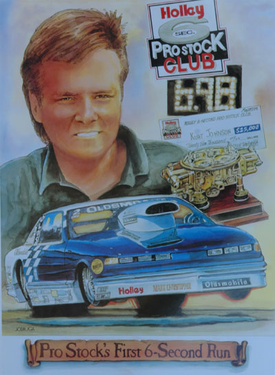 | "Through the years I was fortunate to be given assignments that were associated with many of drag racing’s milestone performance achievements. This included doing portraits of the original 16 members of the Cragar 5-Second Club, Kenny Bernstein breaking the 300 mph barrier, and Warren Johnson recording the first 200-mph Pro Stock run. I took particular enjoyment in doing the poster for Kurt Johnson as the first member of the Holley 6-Second Pro Stock Club, because I was in Englishtown to see it happen. What really sticks out in my mind about that run was watching Greg Anderson, then the crew chief for Kurt’s father Warren, jump in the air after Kurt had cleared the 60-foot mark. The other drivers favored to be the first in the sixes, W.J., Darrell Alderman, and Scott Geoffrion, had already made their runs and come up short, but Anderson, with his trained eye, knew after seeing Kurt’s launch that he was on his way to history, and had a five-second headstart on everybody else in cheering Kurt for his major accomplishment." | ![]() |