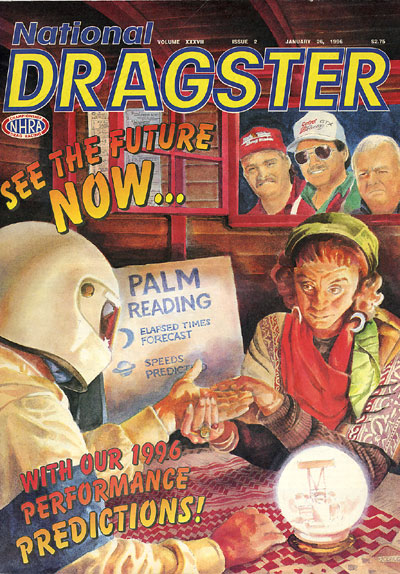 | " Having long been a big fan of Norman Rockwell, I had read in several of his books that he often used his neighbors as reference figures for many of his paintings. We used that approach as well at National DRAGSTER, such as this example of the cover for our annual Performance Predictions issue in 1996. The setting was having a uniformed and helmeted driver visit a gypsy fortune teller, with the 1995 world champs (Scott Kalitta, John Force, and Warren Johnson) peeking through the window. For the model of the fortune teller, I chose our longtime receptionist Ellen Charland, who years ago used to dress up as Snow White to greet visitors at Disneyland. She accepted the assignment with relish and provided much of the accessories for her gypsy costume. For this drawing, I wanted to recreate the atmospheric exaggerated lighting that was often seen on the covers of pulp fiction books of the 1940’s, and then-art director Jill Flores added to the effect with stylized lettering reminiscent of that era." | ![]() |
