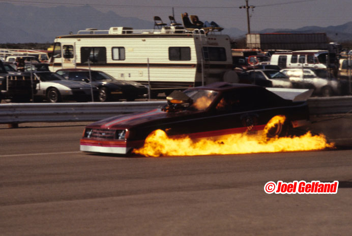 | "Shortly after Firebird International Raceway opened neat Phoenix I covered the first National Time Trials in 1985 for Hot Rod's Drag Racing magazine. This may have been my first time shooting the top end and it didn't take long to get "broken in!" Paul Smith was driving the Bill "Captain Crazy" Dunlap-owned Funny Car. Right at the finish-line the car erupted into a ball of fire. I was standing in the small hill just before the Goodyear bridge with my Nikon F3. Shooting with a 180 2.8 lens at about 1/500 second, F/8 I was able to capture 20 frames before running out of Ecktachrome 100 film. I remember feeling the heat as the car went past me and thinking that the driver was in serious trouble. Smith suffered only minor injuries and was back behind the wheel in just three weeks taking the teams back-up flopper to the final round of the ADRA Winter Nationals in Tucson. After that, Smith parted ways with Dunlap." | ![]() See bigger |