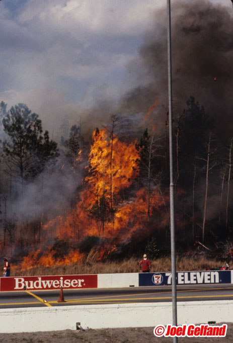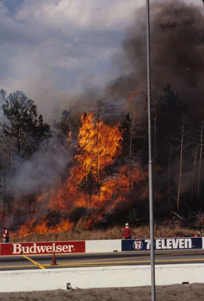 | "I took my first of two trips to Gainesville with Lou Gasparrelli in 1985. During qualifying, Bob Gottschalk attempted to qualify in a nitro flopper for the first time. His attempts were wrought with troubles and on this run the car exploded into flames before the finish line. I was again shooting top end and after getting a couple of shots on the car blazing past me in black & white I watched as Gottschalk went into the shrubs past where the guardrail ended. The fire took off into the woods next to the track, causing a major brush fire. In this shot, members of the NHRA Safety Safari are on the scene as trees near the track are engulfed in fire. There was a delay in qualifying due to the fire and smoke. Gottschalk suffered moderate burns. Nikon F3 @ 1/500 second, Nikkor 35-105 zoom lens. Ecktachrome 100." | ![]() See bigger |
