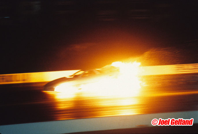 | "This shot of 'Comet Skuza' was shot at the Texas Motorplex in Ennis in 1996. I was sitting in the new top-end bleachers for the Friday night qualifying session and caught Dean's first fuel Funny Car fire. He was uninjured but the same could not be said of the car... Nikon F3 @1/30 sec Nikkor 180 2.8 Fujichrome 1600." | ![]() See bigger |