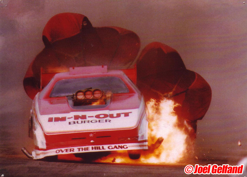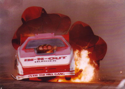 | "When I took this shot of the IN-N-Out Burger Funny Car at the 1993 Winternationals, I was shooting top end for late National DRAGSTER photo editor Les Lovett. I had bought a Nikkor 600 4.0 super-telephoto lens the year before and Les had taken me under his wing and taught me how to use it on the big end of the racetrack. When he felt I knew what I was doing and was smart enough to not get hurt, he had me shooting top-end for him at several races. I also was shooting top end for Dave Wallace and Jon Asher back then. One of the most important things I'd learned was how to work WITH the TV camera operators. They knew I would not get in their way and we got along very well. When I took this shot I had no idea that Oswald and the Over-The-Hill Gang had made an amazing 5.06 run. I was concentrating on: 1) getting as many shots as possible; 2) getting out of Diamond P cameraman Jeff Kelty's way; 3) getting away from the wall; and 4) seeing Oswald get out of the car safely and uninjured. All four things happened! Camera: Nikon F3 Shutter speed: 500th/sec Motor Drive Speed: 6 frames/second Lens: Nikkor 600 4.0 F/8." | ![]() See bigger |