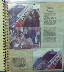 I’m not ashamed to admit that I kept a Prudhomme scrapbook – which I still have – that was filled with my own pictures of the man as well as articles clipped from local newspapers about “the Snake” and the racers he ran and won, ticket stubs, stickers, and more.