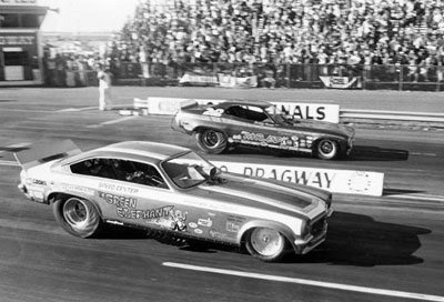 In the summer of ‘74, Hall moved on to handle Jerry Ruth's Mustang Funny Car and Mike Miller took over the controls of the green machine. He was runner-up at the ‘75 NHRA Winternationals when the car broke on the line against Don Prudhomme. After sitting out the 1976 season, the Greens returned to competition with sponsorship from Bardahl. Mike Cyr, who later would buy the Green’s equipment, took Betty’s scrapbooks and left them with Ole Bardahl's daughter, Evelyn Manchester. She liked what she saw and talked her father into sponsoring the team. Cyr initially was slated to drive but it didn’t work out, and future Top Fuel world champ Rob Bruins in the saddle of a new slant-nosed Vega. Veteran nitro wheelman Norm Wilcox also drove the car and Richard Rodgers took the car to runner-up at the ‘77 U.S. Nationals, again to Prudhomme. Prudhomme had qualified his Army-sponsored Plymouth Arrow No. 1 with a 6.06 and ran 6.14, 6.10, 6.13, and a final-round 6.24 to defeat Rogers, who had qualified with a 6.21 and hit a best of 6.31 in eliminations but slowed to a 6.58 in the final after losing traction.