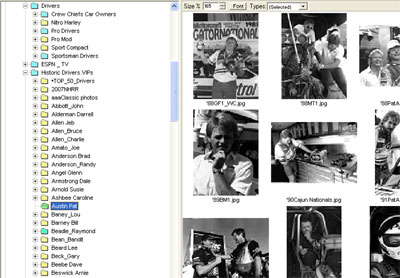 As we all now work in a digital age – the photos we use in DRAGSTER all have to be scanned for printing – the photo staff has been assembling an impressive digital library as well that's available to us on our internal network. Organized by year or by category, it's easy to find a ready-to-print image for NHRA.com or DRAGSTER. Each driver file is again broken down by year and we have a great inventory already of all of the current drivers.