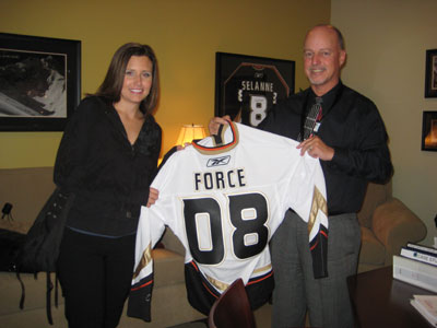 Wagner presented Ashley with her own special-edition Ducks jersey, with the 08 on the back for the current year and, while I'm sure they'd be happy to have her on the team, the Ducks probably are smiling even more about having their real #8, Teemu Selanne, part of last year's Stanley Cup-winning team (his jersey can be seen on the wall behind Force and Wagner), back on the roster after flirting with retirement.
