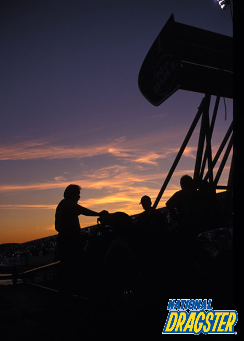 | "The sun had just gone down prior to the Top Fuel final round at the 1998 Winston Finals in Pomona. As the teams waited in the water box, I noticed a little bit of color left in the sky and thought I could capture a photograph that would symbolize the season coming to an end. I manually exposed for the highlights in the sky, which resulted in silhouetting the dragster and crew in the foreground. The dragster in the photo is 1998 Top Fuel world champion Gary Scelzi." | ![]() See bigger |