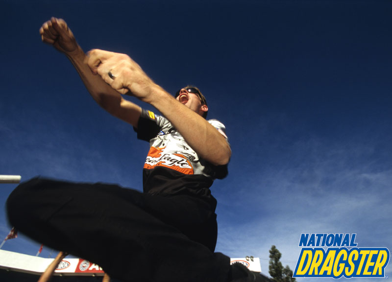 "As the Pro Stock Motorcycles came to the line I was looking for Andrew because I knew this round would determine the 2006 champion. After a couple of minutes I spotted him sitting on a golf cart in front of the grandstands. I knelt down at the front of the golf cart and focused on Andrew with a wide-angle lens. I didn't even watch the race because I wanted to capture Andrew's emotion when he saw the win light. Hines jumped off the golf cart and leapt into the air before being swarmed by his family and crew. He had just won his third consecutive POWERade championship." |
