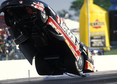 | "This shot of Vern Moats with all four wheels off the ground was taken in Houston in 2003. It was shot cross-track, which means Moats was in the lane farthest from me, and I was using a 300mm lens. This lens is used by almost every drag racing photographer on the circuit week in and week out. You can plan your shots to the best of your ability, have the right exposure, find a clean background, etc., but you can't account for luck. I've shot from this angle 1,000 times, but this photo is another example of being in the right place at the right time. Thanks, Vern." | ![]() See bigger |