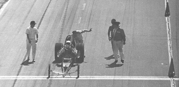 "Garlits’ Swamp Rat I at the 25th annual U.S. Nationals. Garlits brought the recently finished car to Indy, but I don’t think many people knew he was going to run it. Bob Daniels push-started the dragster with his '55 Chevy, and it sure brought back a lot of memories about how they used to do it. The area behind the starting line was packed with drivers, crewmen, officials, and anyone else who could sneak back there. You can see Kalitta, 'Snake,' Colson, Beck, and a bunch of others watching this historic run. Garlits lined up on the outside of the lane to avoid the rubber on the track and had a crewman wipe the tires with a wet rag to make sure the tires would smoke without abusing the clutch. I made sure I placed myself so I could get the whole scene. I thought it a unique touch to have Bob Beezer, the Canadian Indian who used to do a (non)rain dance on the starting line back in the early '60s as a flagman. This was a very moving moment for those who were there."