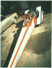 Although I haven't been able to find out whether the crash happened on the car's maiden voyage or if it had been tested locally at a venue such as Detroit Dragway, William McLauchlan said that the car was built on a Logghe chassis and that Al Bergler did the bodywork, including the wedge. (Don Prudhomme's wedge was a Buttera car, and Leland Kolb's was a Woody car, according to McLauchlan, who thinks that the famed Nye Frank built the body on both.)
