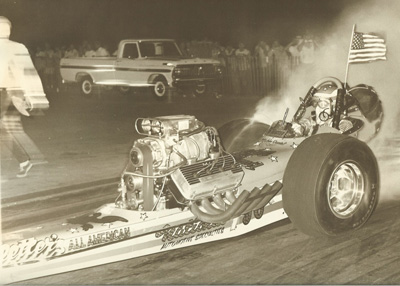My "all America" list was hardly that, especially when it came to cars named All American. Though disappointed but understanding that I had not included his short-lived Art Linkletter's All-American Top Fueler pictured here, Bill Holland said that I needed Carl Casper's Gary Cochran-driven Young American dragster on the list. Note the mini Old Glory attached to the roll cage next to driver John Guedel's helmet.