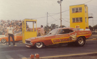 I heard from Tony Williams, who worked at Atco as the announcer and starter from 1972 to 1998 and sent the great photo at right (and several others), showing the Mr. Natural 'Cuda on the starting line for what Williams said is the beginning of the fateful April 1973 run at Atco in which Tom Hall scorched the body.