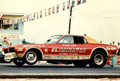 I wondered why the newest Eliminator didn’t bear the III designation (after all, Don Garlits was making a lot of headlines with his sequentially numbered Swamp Rats) until I stumbled across some background information about Mercury Cougars that revealed that Mercury adopted the Eliminator name as a performance package for the Cougars, consisting of a standard 351 or the optional 390, 428CJ, or Boss 302. You also got a racer-like blacked-out grille, side stripes, front and rear spoilers, an optional Ram Air induction system, and a performance-tuned suspension package. I couldn’t find any documentation tying the two together, but because Nicholson (along with Eddie Schartman) was Mercury’s showcase racer, it makes sense that they may have asked him to call the car simply Eliminator. (You can find out more than you ever wanted to know about the Eliminator package here.)