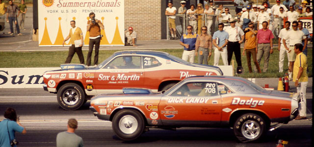 Here's Jeg Coughlin Sr.'s '69 Cuda, driven by Senior himself. McDonald said that his notes indicate that it was Chevy-powered. "I had the pleasure of giving an 8x10 print of this to Jeg at Pomona at the 2004 Finals. My wife had made the mistake of suggesting that we visit California that year, and I said I knew just the right time to go. In our two-and-one-half weeks there, we took in the Goodguys Nostalgia Fuel & Gas Finals at Bakersfield and the NHRA Finals at Pomona (remember the rain?), and in between, we took in the Petersen Automotive Museum, the cruise night at the NHRA Museum, and visited the Museum itself." (Silly wife.)